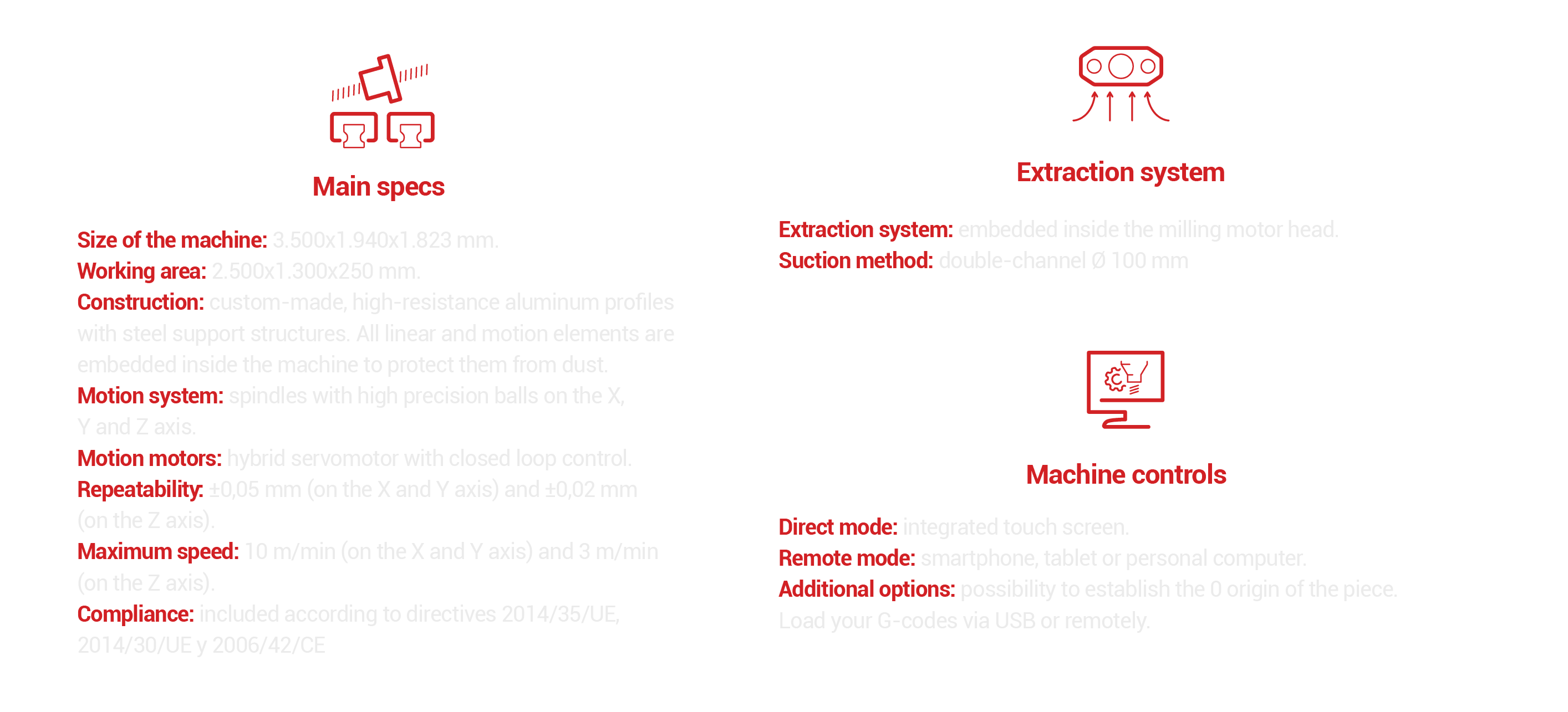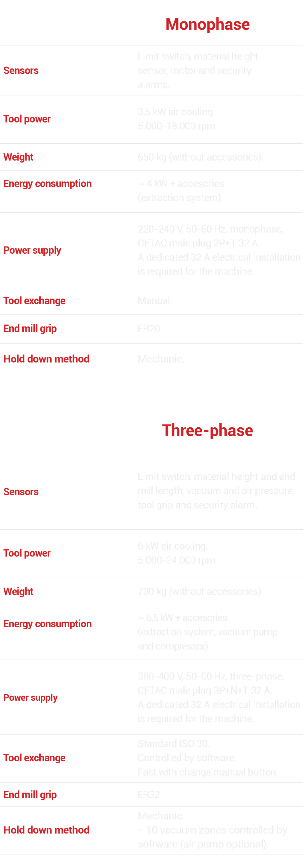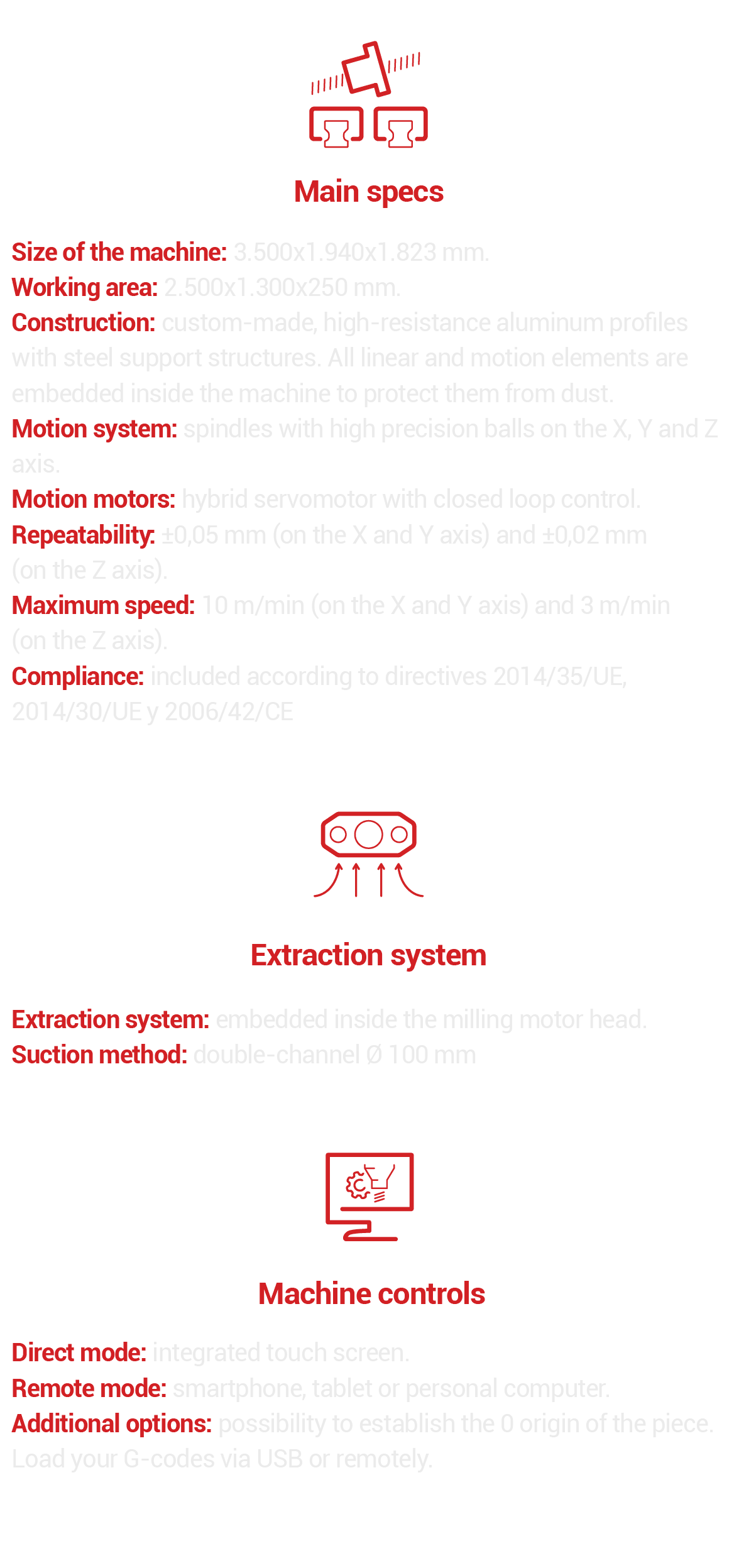 With 6 kW of power and a spinning speed of 24.000 RPM on its milling motor, Fox PRO allows you to easily and rapidly work on wood, non-ferrous metals, plastics and much more. Its integrated double-head extraction system ensures a clean working space always.